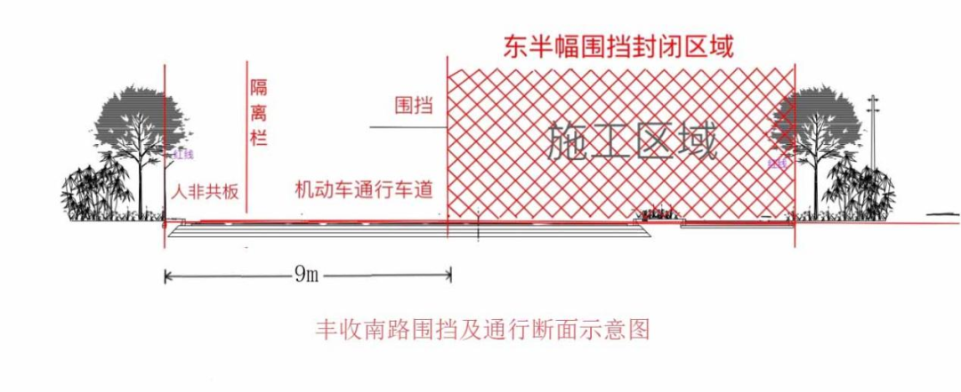 2025年4月18日至2025年5月4日豐收南路東半幅封閉施工。豐收南路西半幅設(shè)置雙向車道,可正常通行。