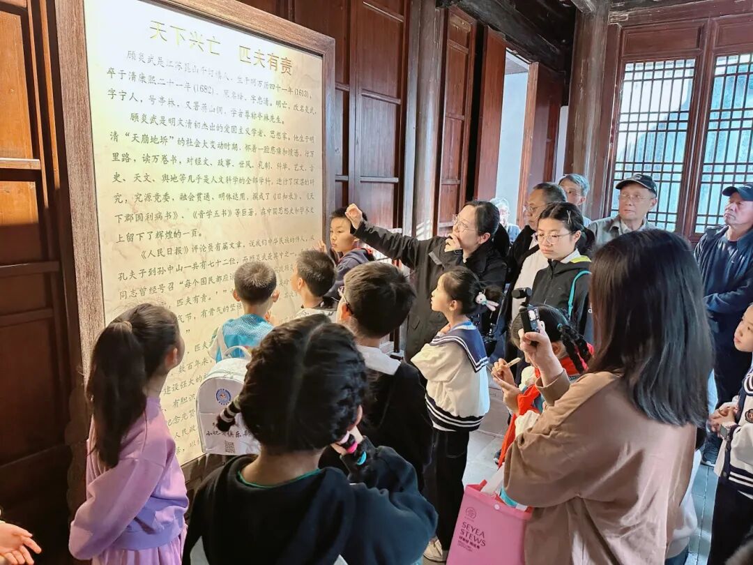 下午1:30,參與研學(xué)活動(dòng)的家長(zhǎng)和孩子首先抵達(dá)千燈鎮(zhèn)顧炎武故居。駐足于大門口、貽安堂、墓碑前,眾人屏息凝神聆聽(tīng)講解,被一代大儒的跌宕人生、偉大思想所深深吸引?!疤煜屡d亡,匹夫有責(zé)”不再是一句耳熟能詳?shù)目谔?hào),而是通過(guò)一磚一瓦、一字一畫,深深印入大家心中。