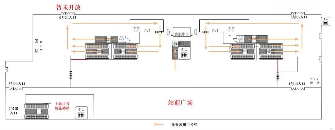 通過出站閘機(jī)后,從1號口出站后至蘇州花橋站3號口、4號口進(jìn)站換乘。